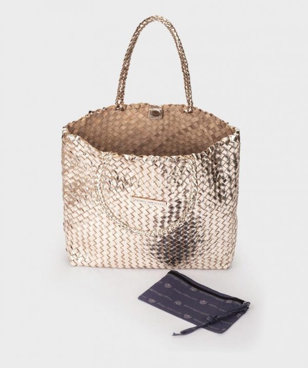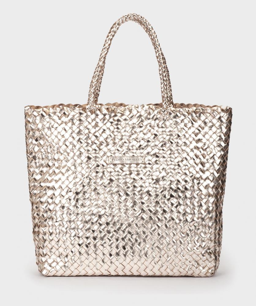 Bolso grande trenzado de piel de color platino. El modelo perfecto para lucir durante todo el día. Su capacidad te permitirá guardar en el todo lo que necesites, desde un ordenador hasta un neceser. Cuenta con cierre con imán y con una bolsita de tela con cremallera.